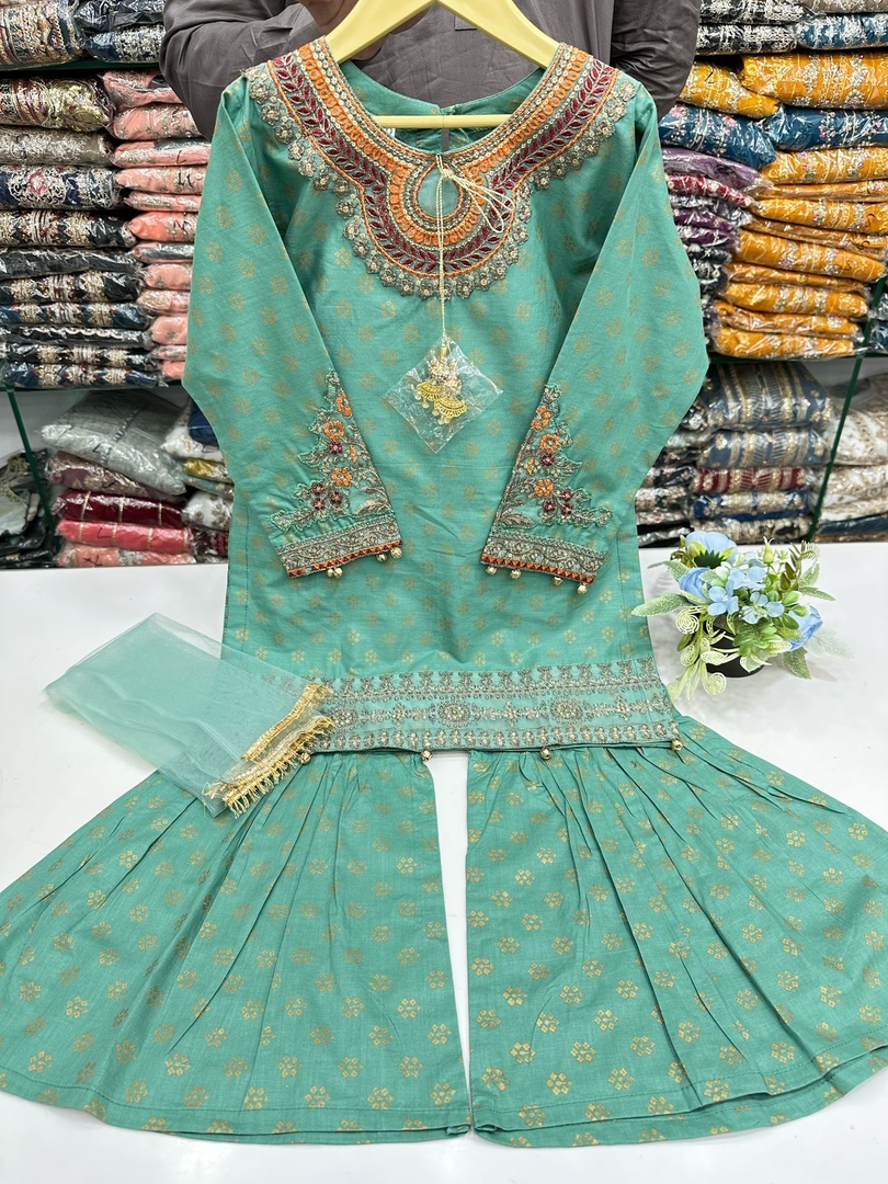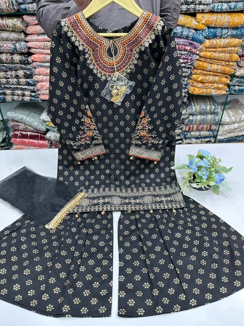 𝐀𝐯𝐚𝐢𝐥𝐚𝐛𝐥𝐞 𝐒𝐭𝐨𝐜𝐤 𝐒𝐢𝐳𝐞𝐬 𝐌𝐞𝐧𝐭𝐢𝐨𝐧𝐞𝐝 𝐎𝐧 𝐄𝐯𝐞𝐫𝐲 𝐏𝐢𝐜New Arrival For Kids Stuff 𝐋𝐚𝐰𝐧_𝐂𝐨𝐭𝐭𝐨𝐧 Shirt With Sharara Tila Thread And Sequence Work Sharara In Same Stuff Dupatta In 𝐍𝐞𝐭 Stuff